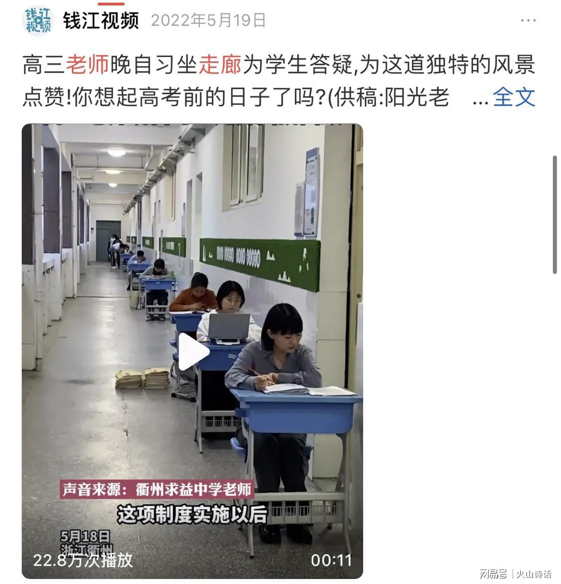 早在2022年5月,就有媒体报道浙江衢州求益中学有过类似措施,在晚自习的时候,将老师的办公桌搬到走廊上,成为一项制度,被媒体高度赞扬。