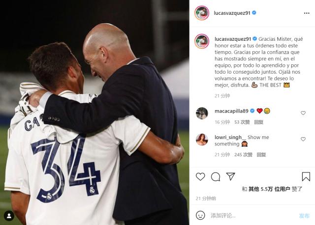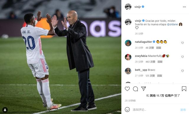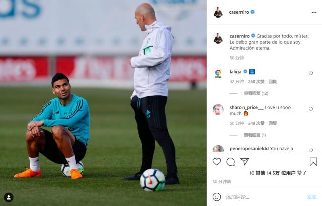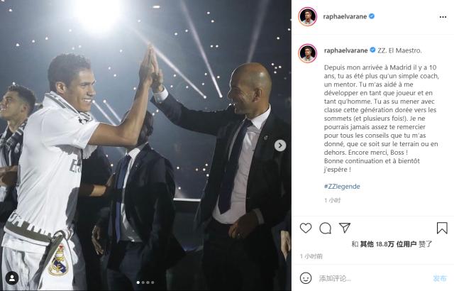 瓦拉内:“齐祖,大师。从10年前我来到马德里,您不仅是一名教练,还是一名导师。 您带我成长为一名球员,成为一个男人。 您带领着黄金一代登顶欧洲(甚至多次)。无论您在场内还是场外,对于您给我的所有建议,我都感激不尽。 再次感谢!祝你好运,很快我们还会再见!”